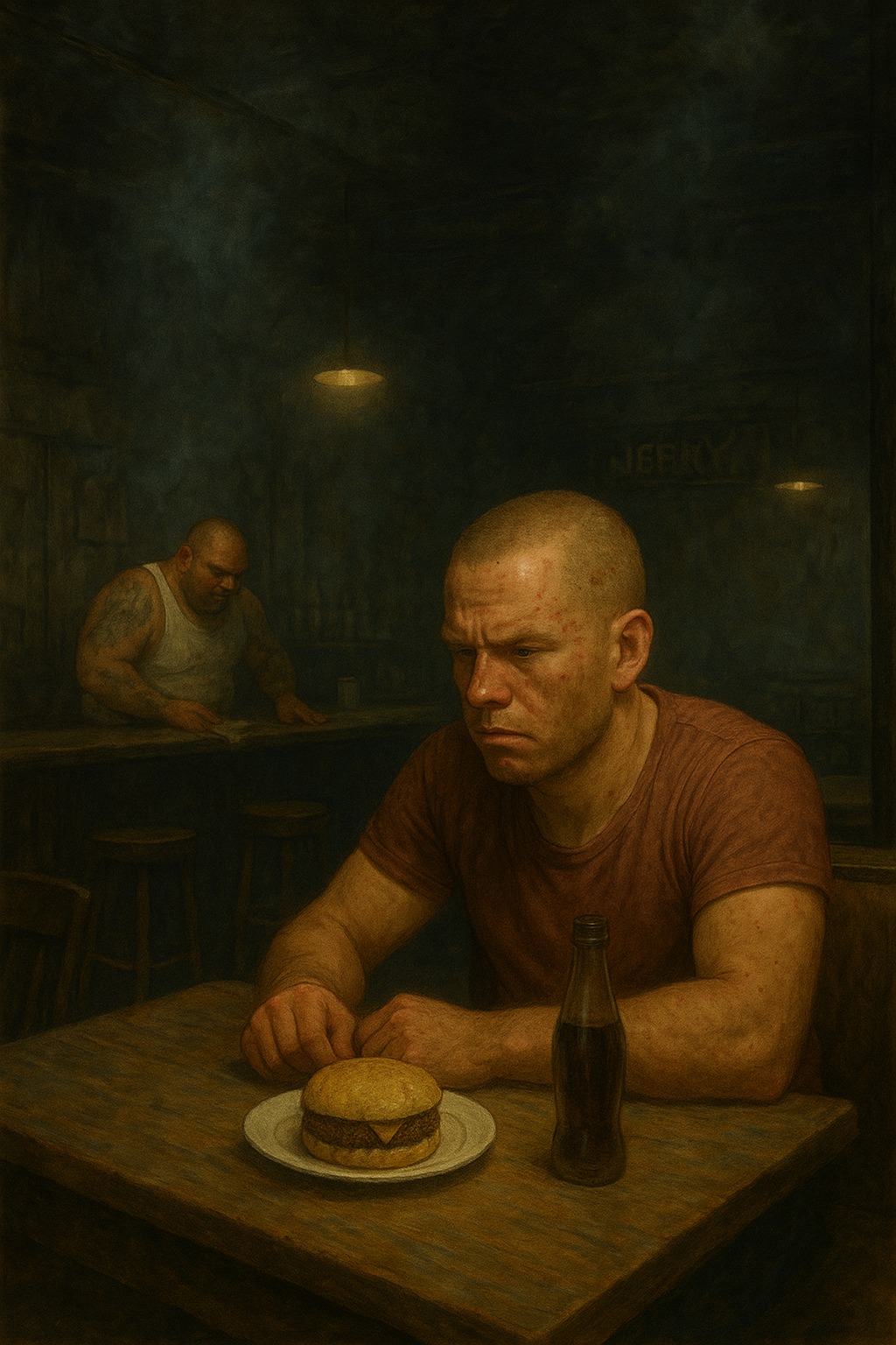 An einem der Tische in der hinteren Reihe sitzt er, Daniel. Die leicht rötlichen Haare sind auf der fast kahlrasierten Matte kaum zu vernehmen, das Gesicht aufgedunsen und voller wenig ansehnlicher Pickel. Hygiene ist offenbar eher ein Thema für die anderen, nicht für ihn. Vor ihm auf dem Tisch steht ein Glas Cola, direkt daneben liegt ein angenagter Burger. Die Uhr zeigt zehn nach zwölf Uhr, um zwölf wollte ER erscheinen. Daniel wirkt angestrengt, hampelt ein wenig auf seiner Sitzbank herum und wäre am liebsten am Tresen, um sich dort einen schmutzigen Harald einzuverleiben. Doch er hat sein Wort gegeben, dass er in einem Zustand sein wird, in dem er IHM wenigstens zuhören kann.